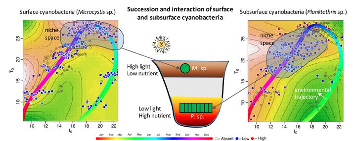Subsurface cyanobacterial blooms, are a significant source of odor problems in source water and have been recorded in many oligotrophic/mesotrophic drinking water reservoirs. In this study, we explored the key driving forces responsible for the succession between surface and subsurface cyanobacteria using ecological niche modelling based upon a case study in Miyun Reservoir, China. The results suggest a negative effect of water depth and surface light irradiance (I₀) on subsurface Planktothrix sp. growth (p-values < 0.001), and a unimodal effect of surface water temperature (T₀) with the optimum at 23 ℃ (p-value < 0.001). While the surface Microcystis spp. shows a strong positive relationship with temperature (T₀; p-value < 0.001), and significant effects for the interaction between T₀ and I₀ (p-value < 0.01). In addition, we identified the extent and type of interaction between subsurface and surface cyanobacteria and conclude that the high irradiance surface water combined with sufficient nutrients at the pre-bloom stage are key factors responsible for the preferential growth of surface cyanobacteria, while the gradual decline of the surface cyanobacteria in post-bloom stage is associate with nutrient reduction. This decline and loss of surface populations enhanced underwater irradiance and thus promoted the growth and allowed for succession of subsurface cyanobacteria in deeper layers where the nutrient supply was still adequate. Based upon this, the growth potentials for the subsurface and surface cyanobacteria are different under different environmental conditions: the subsurface cyanobacteria have greater growth potential than surface cyanobacteria in shallow oligotrophic and deep eutrophic reservoirs during median light irrigation seasons.