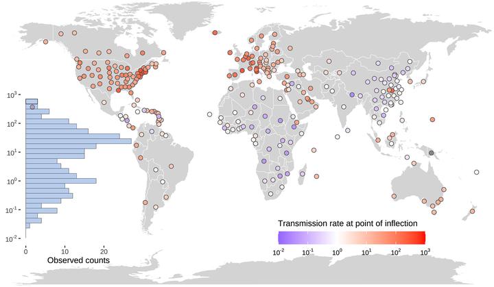 The outbreak of coronavirus disease 2019 (COVID‐19) showed various transmission rate (Rt) across different regions. The determination of the factors affecting transmission rate is urgent and crucial to combat COVID‐19. Here we explored variation of Rt between 277 regions across the globe and the associated potential socioeconomic, demographic, and environmental factors. At global scale, the Rt started to decrease approximately 2 weeks after policy interventions initiated. This lag from the date of policy interventions initiation to the date when Rt started to decrease ranges from 9 to 19 days, largest in Europe and North America. We find that proportion of elderly people or life expectancy can explain ~50% of variation in transmission rate across the 277 regions. The transmission rate at the point of inflection (RI) increases by 29.4% (25.2–34.0%) for 1% uptick in the proportion of people aged above 65, indicating that elderly people face ~2.5 times higher infection risk than younger people. Air temperature is negatively correlated with transmission rate, which is mainly attributed to collinearities between air temperature and demographic factors. Our model predicted that temperature sensitivity of RI is only −2.7% (−5.2–0%) per degree Celsius after excluding collinearities between air temperature and demographic factors. This low temperature sensitivity of RI suggests that a warm summer is unlikely to impede the spread of COVID‐19 naturally.