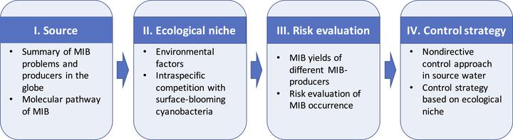 Odor problems in source water caused by 2-methylisoborneol (MIB) have been a common issue in China recently, posing a high risk to drinking water safety. The earthy-musty odorant MIB has an extremely low odor threshold (4–16 ng/L) and is hard to remove via conventional processes in drinking water plants (DWP), and therefore could easily provoke complaints from consumers. This compound is produced by a group of filamentous cyanobacteria, mainly belonging to Oscillatoriales. Different from the well-studied surface-blooming Microcystis, filamentous cyanobacteria have specific niche characteristics that allow them to stay at a subsurface or deep layer in the water column. The underwater bloom of these MIB producers is therefore passively determined by the underwater light availability, which is governed by the cell density of surface scum. This suggests that drinking water reservoirs with relatively low nutrient contents are not able to support surface blooms, but are a fairly good fit to the specialized ecological niche of filamentous cyanobacteria; this could explain the widespread odor problems in source water. At present, MIB is mainly treated in DWP using advanced treatment processes and/or activated carbon, but these post-treatment methods have high cost, and not able to deal with water containing high MIB concentrations. Thus, in situ control of MIB producers in source water is an effective complement and is desirable. Lowering the underwater light availability is a possible measure to control MIB producers according to their niche characteristics, which can be obtained by either changing the water level or other measures.