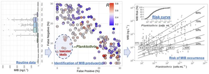 Identification of MIB(2-methylisoborneol)-producing cyanobacteria in source water has been a big challenge for reservoir authorities because it normally requires isolation of cyanobacteria strains. Here, a protocol based on Pearson’s product moment correlation analysis combined with standardized data treatment and expert judgement was developed to sort out the MIB producer(s), mainly based on routine monitoring data from an estuary drinking water reservoir in the Yangtze River, China, and a risk model using quantile regressions was established to evaluate the risk of MIB occurrences. This reservoir has suffered from MIB problems in summer since 2011. Among 323 phytoplankton species, Planktothrix was judged to be the MIB producer in this reservoir because it exhibited the highest correlation coefficient (R = 0.60) as well as the lowest false positive-ratio (FP% = 0) and false-negative rate (FN% = 14). The low false-positive rate is particularly important, since MIB should not detected without detection of the producer. A high light extinction coefficient ( k = 5.57 ± 2.48 m⁻¹) attributed to high turbidity loading in the river water lowered the subsurface water light intensity, which could protect the low irradiance Planktothrix from excessive solar radiation, and allow them to grow throughout the summer. The risk model shows that the probability of suffering unacceptable MIB concentrations (>15 ng L⁻¹) in water is as high as 90% if the cell density of Planktothrix is >609.0 cell mL⁻¹, while the risk will be significantly reduced to 50% and 10% at cell densities of 37.5 cell mL⁻¹ and 9.6 cell mL⁻¹, respectively. The approach developed in this study, including the protocol for identification of potential producers and the risk model, could provide a reference case for the management of source water suffering from MIB problems using routine monitoring data.
